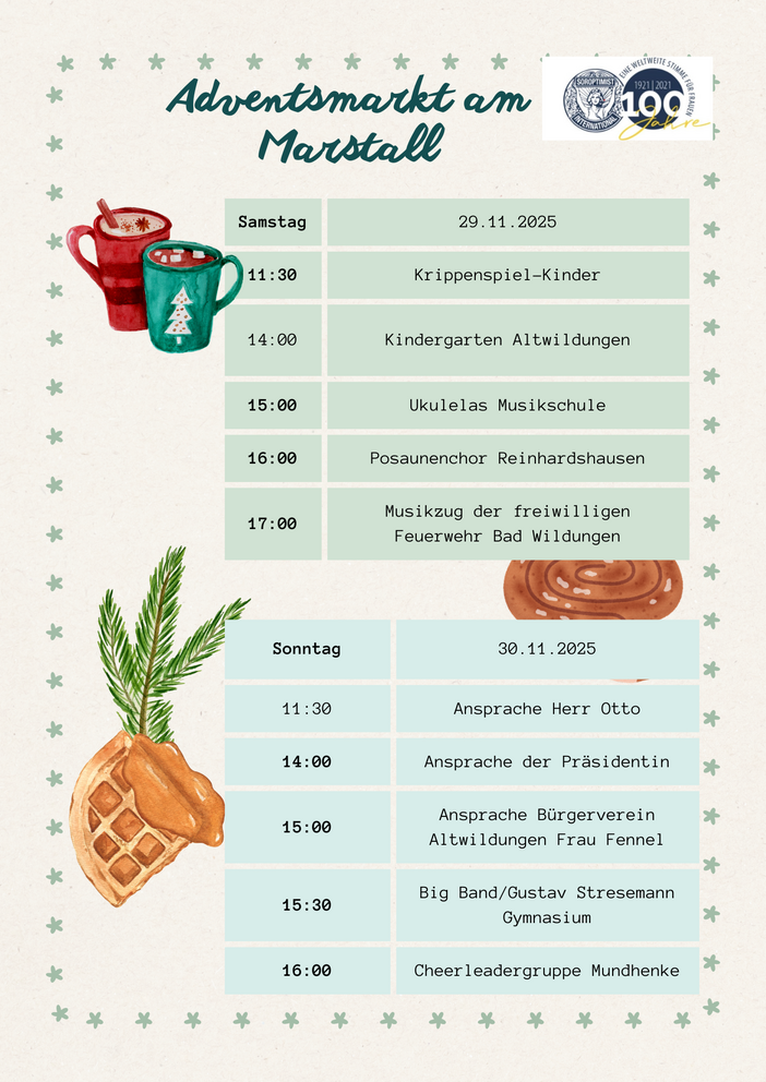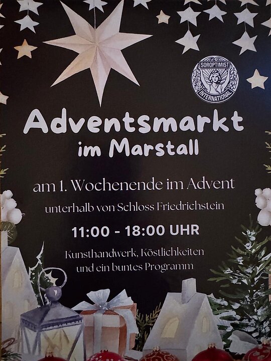 Die Bad Wildunger Soroptimistinnen freuen sich, auch in diesem Jahr zum traditionellen Adventsmarkt am Marstall in Altwildungen einzuladen. Am 29. und 30. November verwandelt sich der historische Marstall und der Hof unterhalb von Schloß Friedrichstein in einen festlichen Treffpunkt voller Licht, Düfte und Begegnungen.